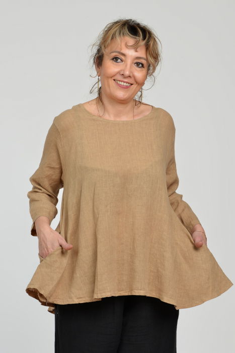 Rochie midi A-line din in mercerizat cu buzunare si volan, bej