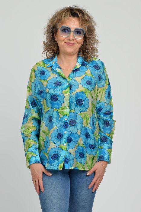 Camasa vaporoasa oversize, cu imprimeu floral albastru cu verde
