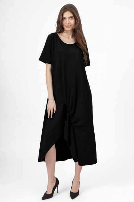 Rochie lunga A-line neagra, din tricot de bumbac cu siret la poale