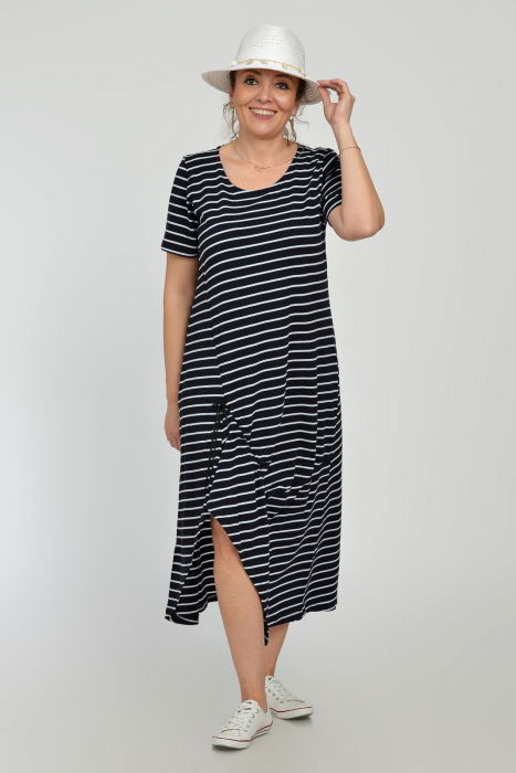 Rochie lunga A-line din tricot de vascoza cu siret la poale, bleumarin cu dungi albe