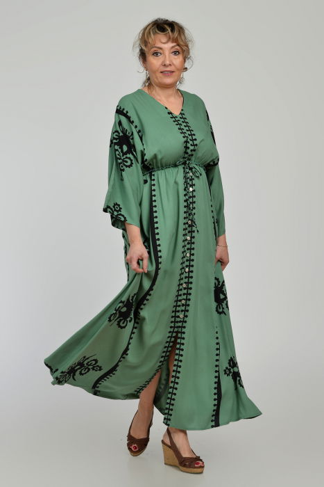 Rochie lunga, kaki, cu elastic in talie si imprimeu decoativ alb, din vascoza