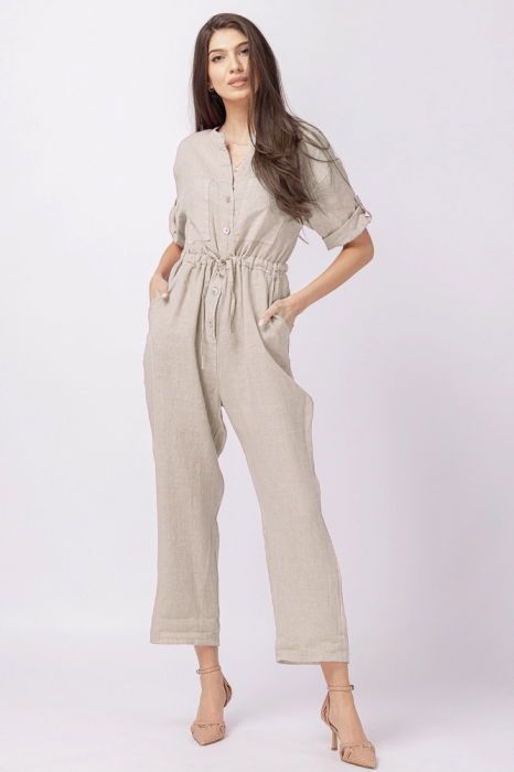 Compleu din in, cu nasturi decorativi, cu pantaloni si bluza tunica mai lunga in spate, turcoaz