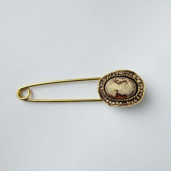 Brosa camee metalica auriu antichizat cu pietricele alb-argintii, tip ac