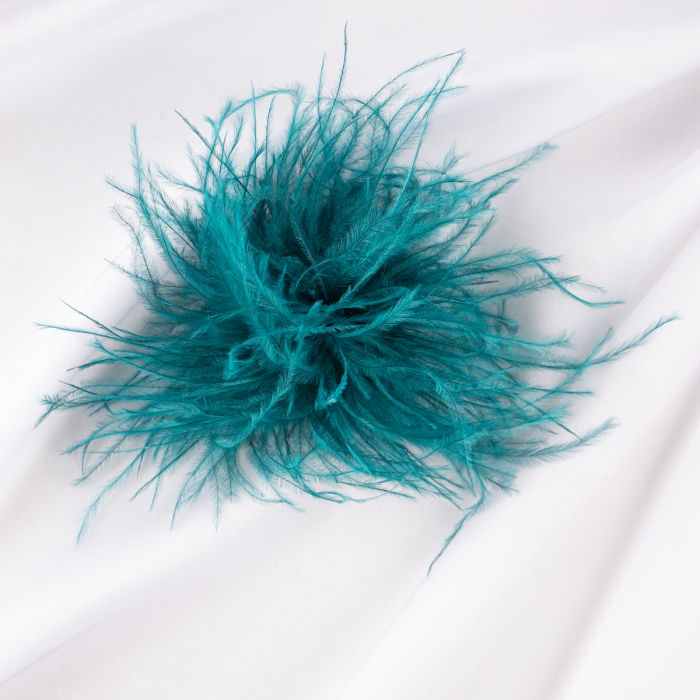 Brosa puf pene fine turcoaz cu diametru de 15 cm, cu clips pentru par