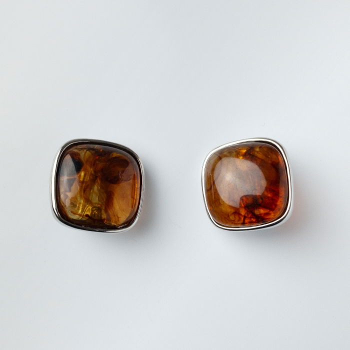 Cercei metalici argintii cu clips in forma patrata cu chihlimbar sintetic