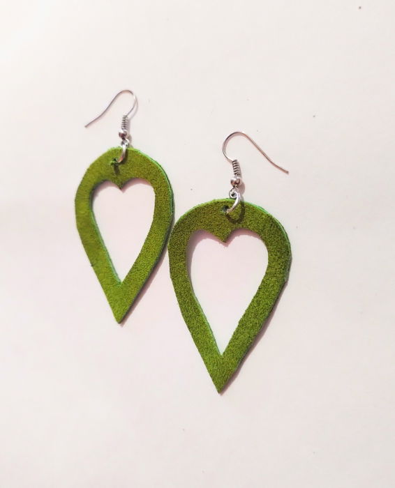 Cercei verzi ,din piele naturala, in forma de inimioare