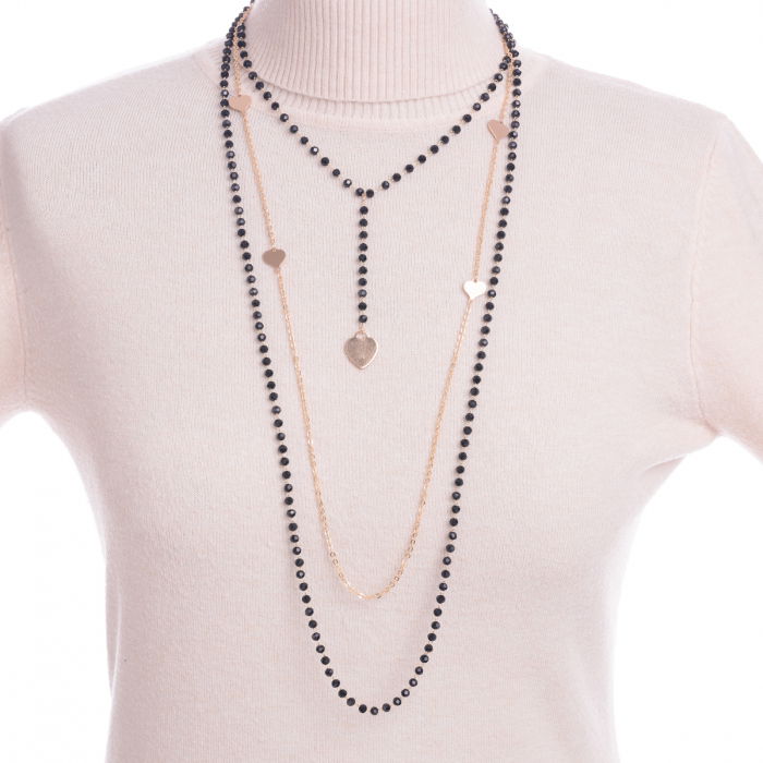 Colier lung cu 3 siruri cu inimi metalice aurii si lanturi cu margelute negre