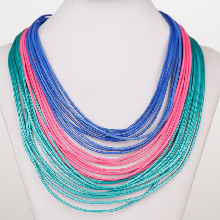 Colier cu multe siruri inegale, in trei culori: albastru, fucsia si turcoaz