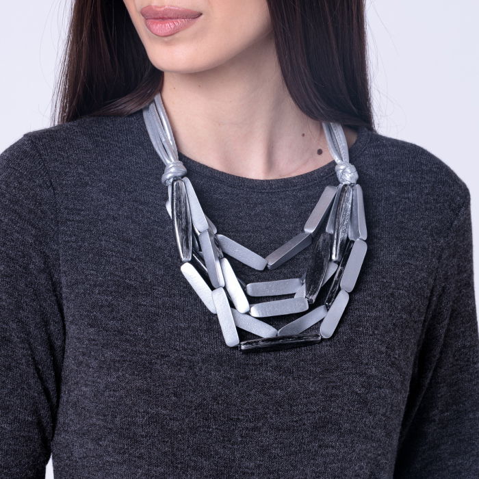 Colier silicon cu 2 siruri si elemente diferite forme din metal argintiu