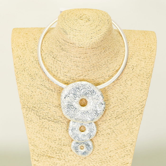 Colier rigid cu 3 cercuri din metal argintiu cu aspect de lovitura de ciocan