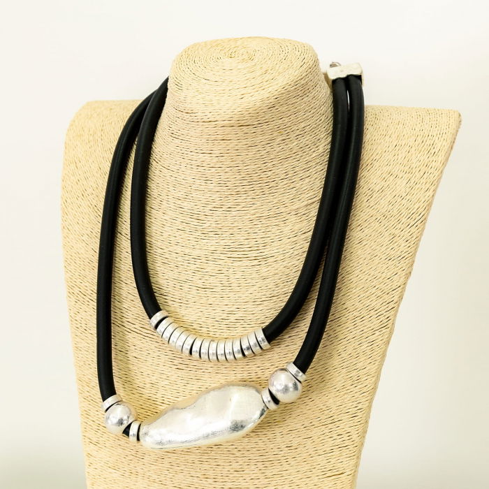 Colier lung din silicon negru cu pandant cu aspect sculptural din metal argintiu