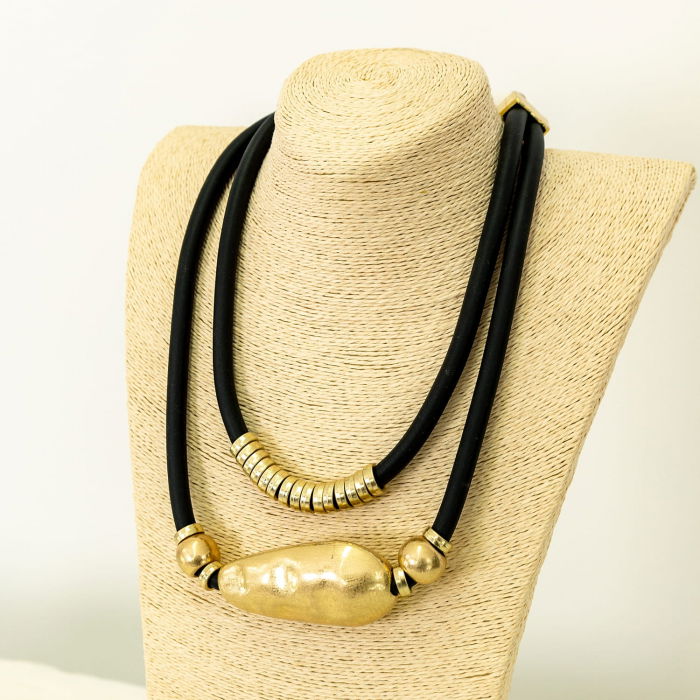 Colier scurt din silicon negru cu pandant cu aspect organic din metal auriu