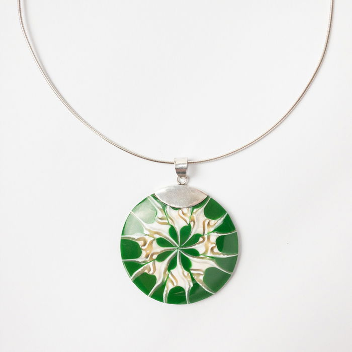 Pandant rotund 4 cm din rasina realizata manual cu aplicatie din argint 925, verde cu alb
