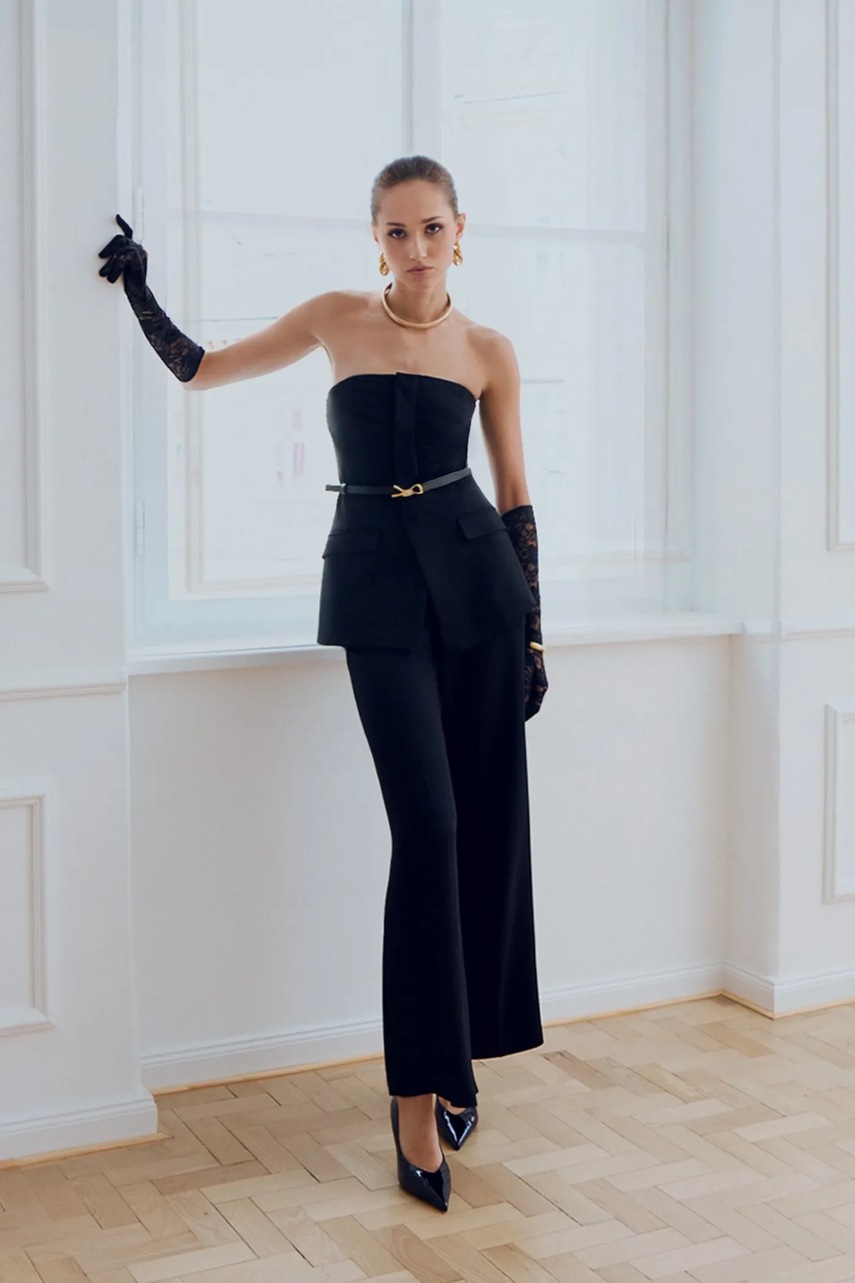 Karl Lagerfeld salopetă cu accesoriu lnu TAILORED JUMPSUIT negru cu decolteu în formă de diamant B1W13010