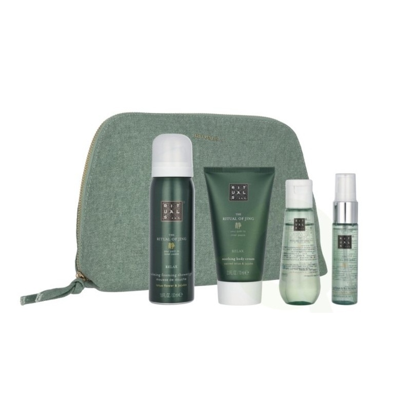 Set cadou Rituals The Ritual of Jing Relax Set – Crema de corp 70 ml, Spuma de dus 50 ml, Ulei uscat 50 ml, Spray Pillow Mist 20 ml