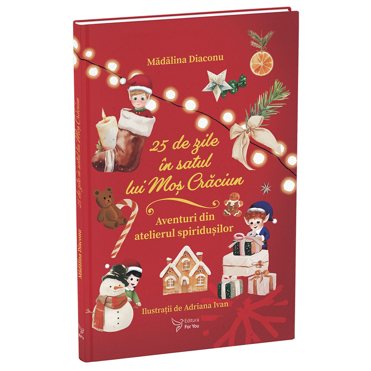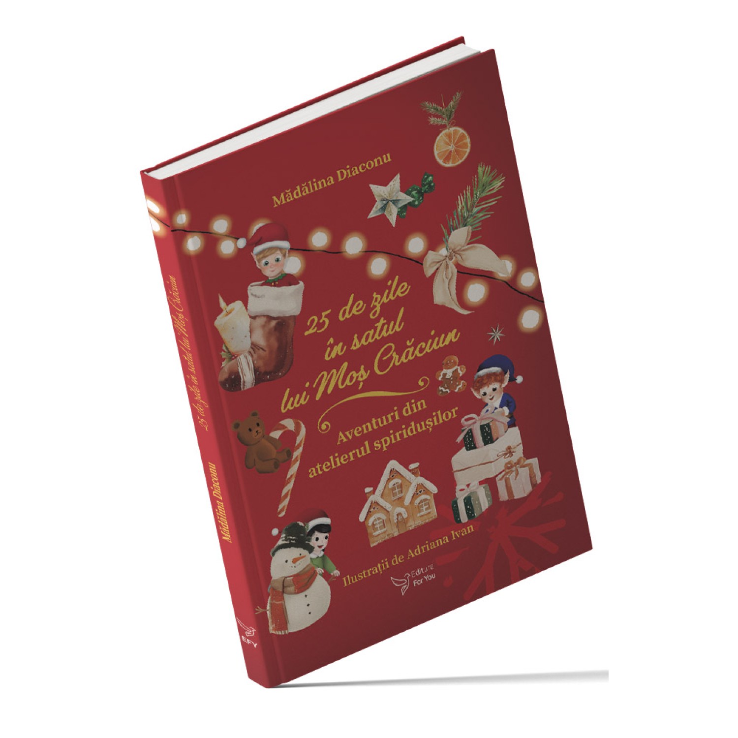 25 de zile in satul lui Mos Craciun este o carte-cadou pentru sufletul copiilor, menita sa transforme asteptarea Craciunului intr-o adevarata sarbatoare a imaginatiei si a valorilor. Gandita ca un calendar literar de Advent, cartea cuprinde 25 de povesti magice, cate una pentru fiecare seara din 1 pana in 25 decembrie.In fiecare poveste, micii spiridusi din atelierul Mosului se confrunta cu provocari neasteptate, invata lectii pretioase si descopera cat de importante sunt prietenia, generozitatea, responsabilitatea si curajul.Scrisa cu grija si suflet, aceasta carte este perfecta pentru copiii cu varste intre 3-10 ani, fie ca o citesc singuri, fie ca o descopera alaturi de parinti sau educatori.Deschideti usa catre lumea fermecata a atelierului lui Mos Craciun si al spiridusilor si lasati fiecare seara din decembrie sa aduca o noua aventura, o noua emotie si o noua lectie de viata!Pentru Tudor, fiul meu, si pentru toti copiii care vor descoperi aceasta carte.Imi doresc ca fiecare poveste sa va aducabucurie, sa va aprinda imaginatia si sa va invete sa iubiti cu inima deschisa.Sa pastrati mereu in suflet magia Craciunuluisi valorile care ne fac mai buni: generozitatea, curajul si bunatatea.DESPRE AUTOAREMadalina Diaconu activeaza de peste zece ani in domeniul marketingului si comunicarii, unde cuvintele sunt instrumentele ei de zi cu zi. Obisnuita sa construiasca povesti care inspira si sa dea viata ideilor prin mesaje creative, Madalina si-a descoperit, odata cu venirea pe lume a fiului ei, Tudor, un baietel plin de curiozitate si imaginatie, o noua pasiune: literatura pentru copii.Cartea 25 de zile in Satul lui Mos Craciun - Aventuri din atelierul spiridusilor marcheaza debutul sau editorial si ne poarta intr-o lume magica, unde fiecare zi din calendarul de Advent ascunde o poveste. Nu sunt simple povesti scurte, ci aventuri bogate in detalii si descrieri menite sa le stimuleze celor mici imaginatia, completate de dialoguri jucause care dau viata personajelor.Prin acest volum, Madalina invita copiii si parintii sa petreaca impreuna 25 de seri de poveste, descoperind magia Craciunului si bucuria lecturii.