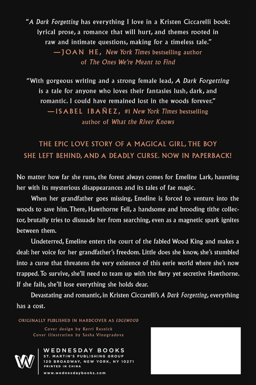 Preorder now and receive this stunning DELUXE EDITION―featuring beautiful stained edges and a brand new bonus chapter destined to make readers everywhere fall even more in love. This breathtaking collectible is a must-have for any book lover.#1 New York Times bestselling author Kristen Ciccarelli weaves the epic love story of a magical girl, the boy she left behind, and a deadly curse.Lush, dark, and romantic. I could have remained lost in the woods forever. -- Isabel Ibanez, #1 New York Times bestselling author of What the River KnowsNo matter how far she runs, the forest always comes for Emeline Lark, haunting her with its mysterious disappearances and its tales of fae magic.When her grandfather goes missing, Emeline is forced to venture into the woods to save him. There, Hawthorne Fell, a handsome and brooding tithe collector, brutally tries to dissuade her from searching, even as a magnetic spark ignites between them.Undeterred, Emeline enters the court of the fabled Wood King and makes a deal: her voice for her grandfathers freedom. Little does she know, shes stumbled into a curse that threatens the very existence of this eerie world shes now trapped in. To survive, shell need to team up with the fiery yet secretive Hawthorne. If she fails, shell lose everything she holds dear.Devastating and romantic, in Kristen Ciccarellis A Dark Forgetting, everything has a cost.Darkly gorgeous and moving... full of curses and fae magic that will capture your heart and wrap it in thorns before setting you free again, forever changed. -- Evelyn Skye, New York Times bestselling author of The Crowns Game