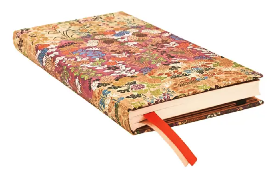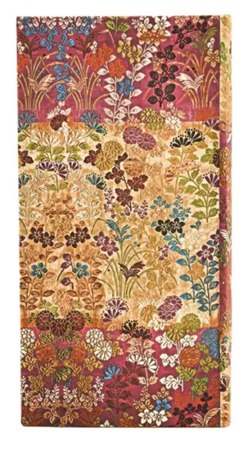 Agenda 2026 - Paperblanks - Kara-ori Pink (Japanese Kimono) - Slim 12-Month Horizontal Hardcover FlexiShowcasing silk dyed with beni (the pigment extracted from safflower petals) and lacquered in gold, our Kara-ori Pink pattern is inspired by a kimono design that dates to the Edo period, when it was used as a costume for the theatrical style known as Noh. This exquisite embroidery also inspired our first design, Kara-ori, from this Japanese Kimono series.