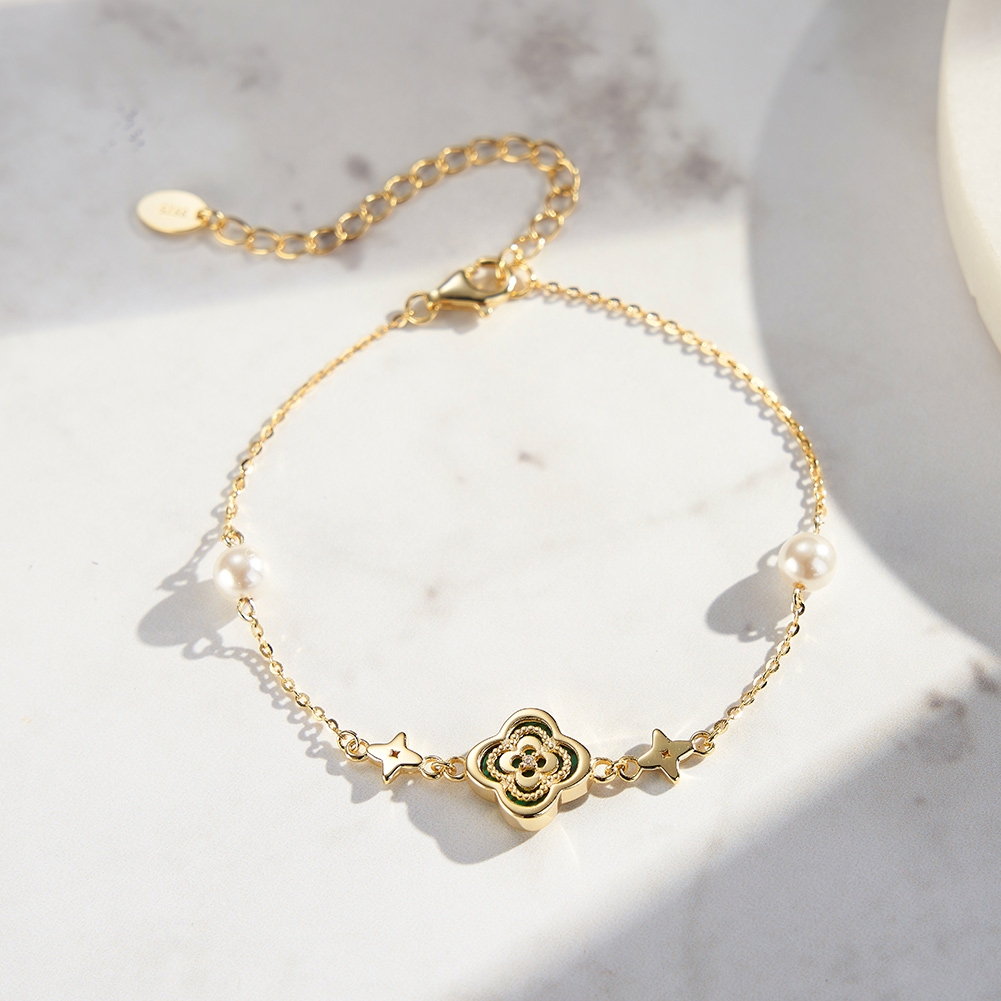 material: Argint 925 placat cu aur; grosime bratara: 1 mm; lungime bratara: 16.5 + 5 cm; perla naturala de apa dulce; dimensiune perla: 5 mm; dimensiune trifoi: 10 mm; gramaj aprox.: 2.63 g; finisaje premium, de lux. Ingrijirea bijuteriilor : Dupa purtare va recomandam sa pastrati bijuteriile in ambalajul original sau intr-un saculet dintr-un material moale, pentru a evita zgarieturile. Pentru a le reda stralucirea este necesar sa le stergeti cu o carpa moale sau cu solutii speciale pentru curatarea argintului. Inainte de culcare, baie sau activitati similare in care bijuteriile ar intra in contact cu apa, produse cosmetice, detergenti, corozive sau chimice, scoateti bijuteriile deoarece aceste produse pot decolora sau modifica stralucirea. Evitati loviturile bruste deoarece ar putea cauza zgarieturi, ciobiri si alte daune si nu lipiti cristalele dezlipite cu adezivi tip super glue, picatura sau orice alt tip.