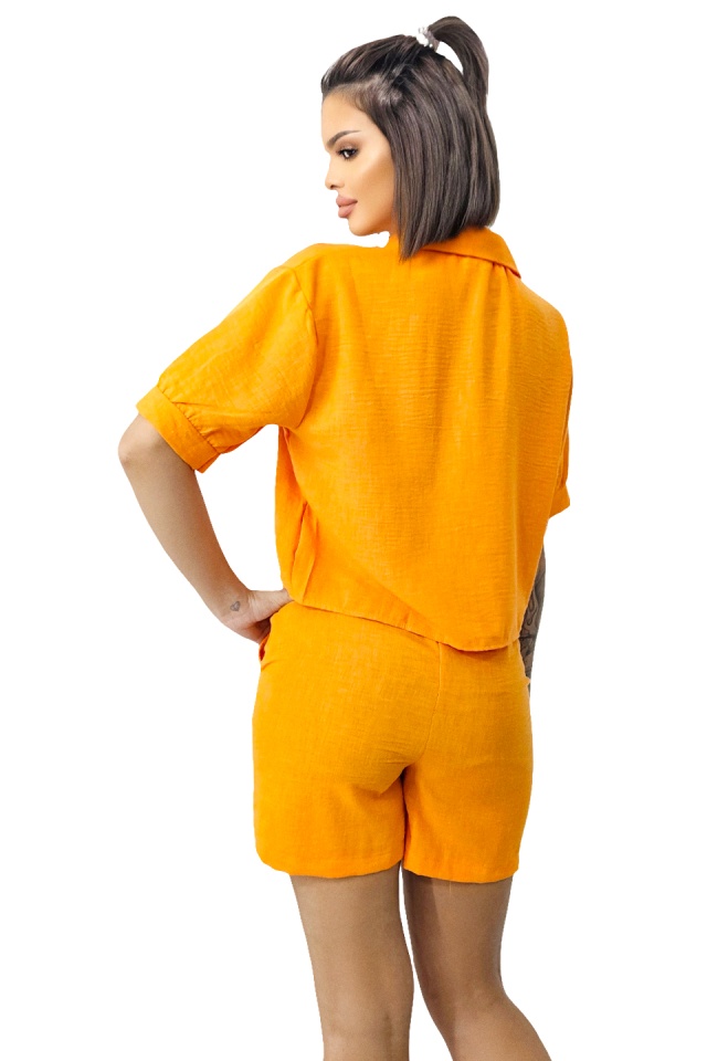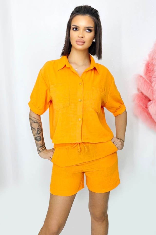Compleu cu bumbac creponat, Keona, camasa si pantaloni scurti cu snur, Portocaliu