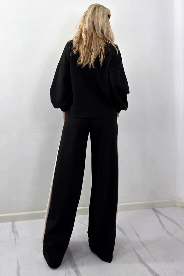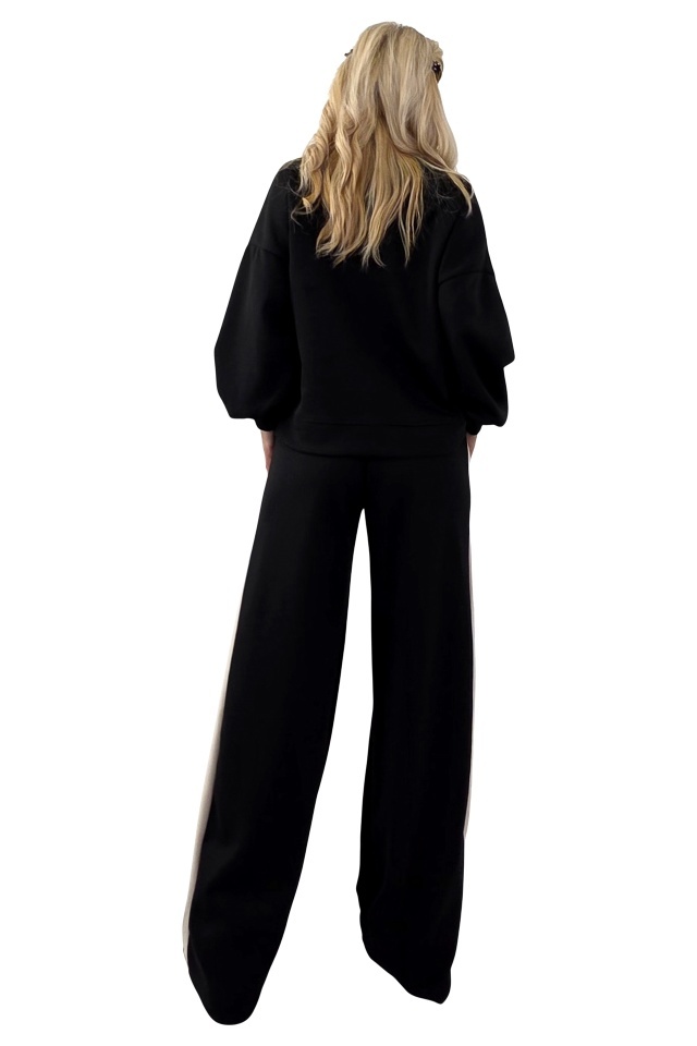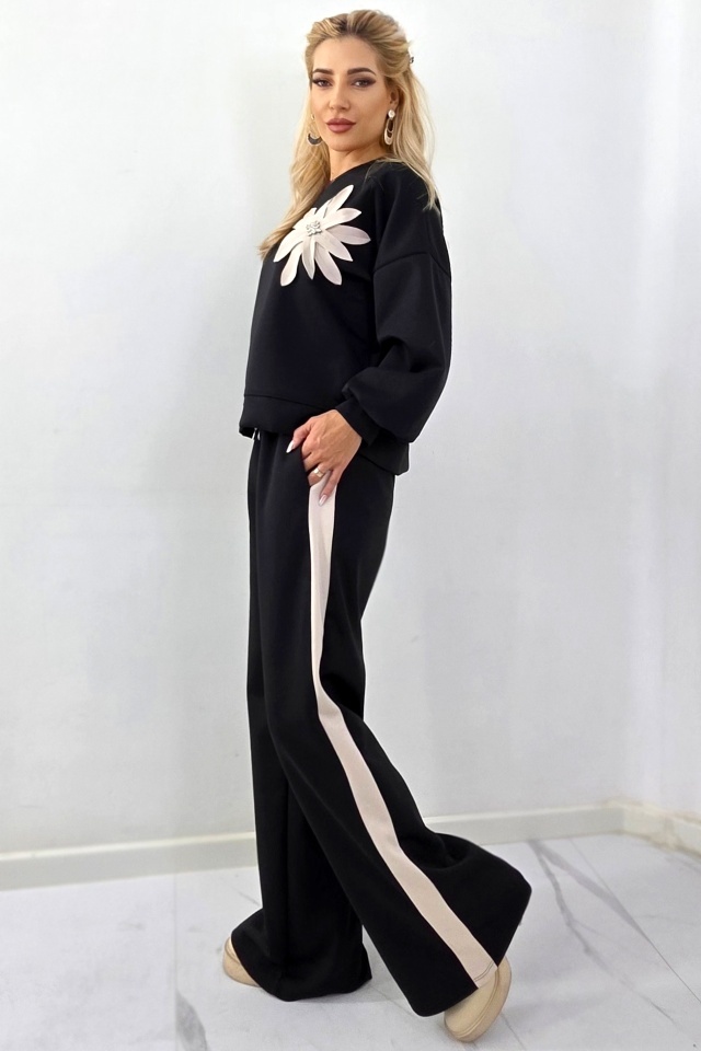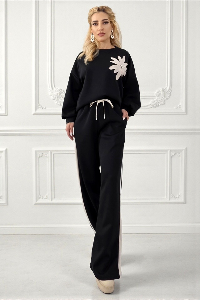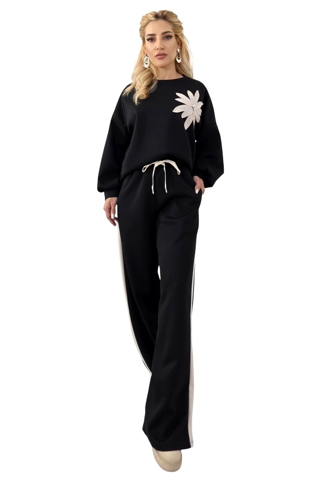 Compleu de zi KEORA, bluza cu detaliu floral si pantaloni lejeri, Negru, Marime S/M/L