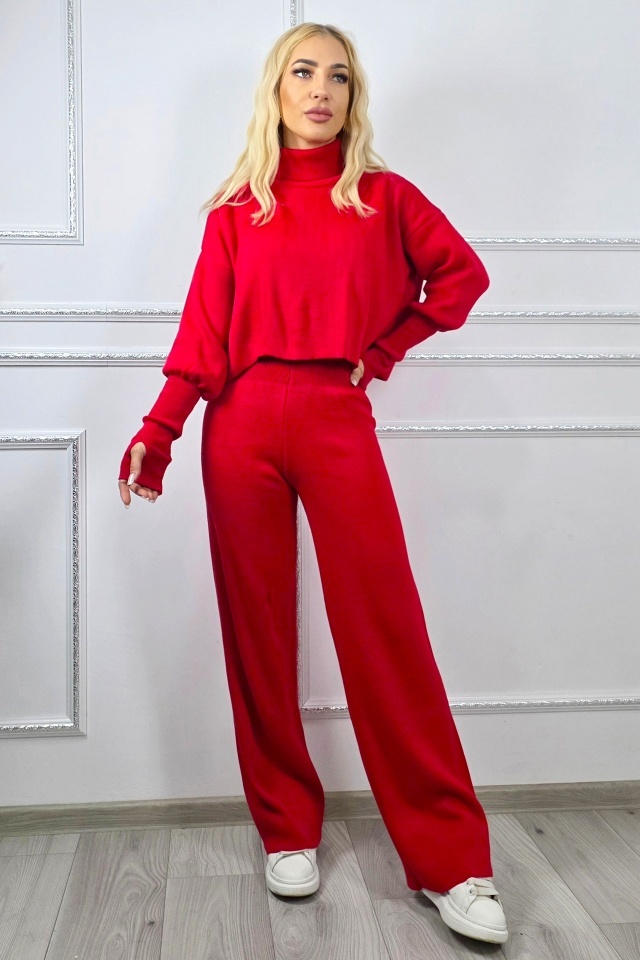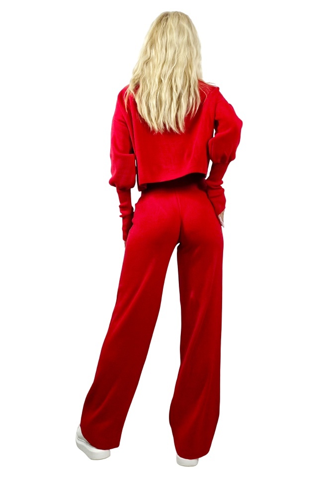 Compleu tricot cu lana COMFY, bluza cu mansete supradimensionate si pantaloni, Rosu, Marime S/M/L