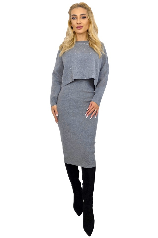 Compleu tricot din doua piese, cu rochie Caryne si bluza oversize, GRI, Marime S/M
