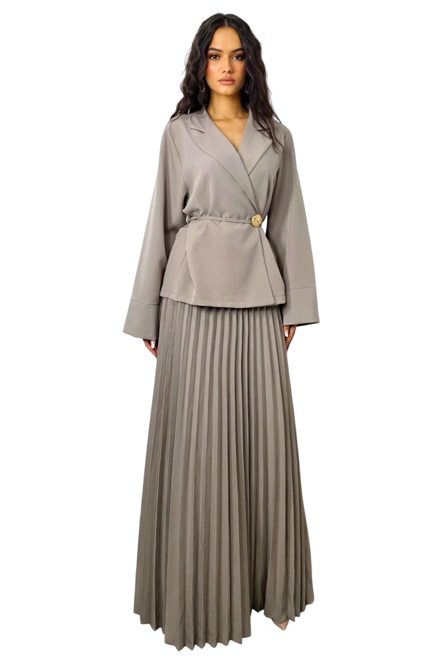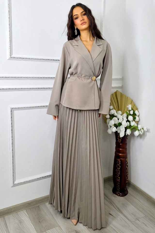 Costum office, cu brosa LUNIS, fusta lungime oversize si sacou, GRI, Marime S/M/L