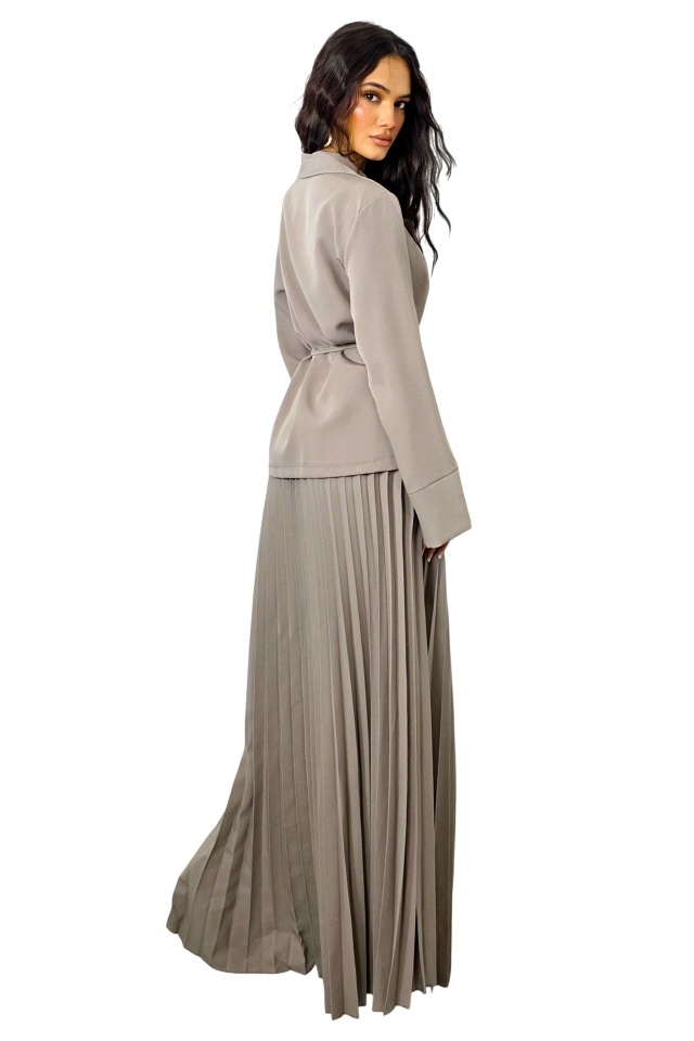 Lunis – business oversize cu atitudine modernă. Sacoul și fusta care dau tonul modei office. Compleul business Lunis este creat pentru femeia modernă care caută un echilibru între stil, lejeritate și funcționalitate. Sacoul are o croială oversize, reinterpretată într-un design petrecut, ce se înfășoară natural pe siluetă și se leagă cu șnur lateral, oferind libertate de ajustare și un aer nonconformist, dar elegant. Acest tip de croială aduce un plus de dinamism și un aspect relaxat, fiind perfect pentru ținutele business actuale. Fusta cu lungime oversize completează armonios ansamblul, având un tipar plisat care creează un joc de texturi și volum controlat. Talia elastică îi conferă versatilitate și confort, adaptându-se cu ușurință diferitelor siluete. Împreună, sacoul și fusta formează un compleu ce iese din tiparele clasice, propunând o versiune modernă a costumului business, ideal pentru femeile care își doresc să transmită încredere și stil prin ținute impecabile. Lunis este un outfit statement, potrivit atât pentru birou, cât și pentru evenimente de zi, unde eleganța contemporană și libertatea de mișcare sunt esențiale. Este un compleu care transformă clasicul într-o expresie modernă a feminității urbane. Caracteristici compleu: - fusta cu lungime oversize (110 cm) si croiala plisata cu banda elastica in talie - sacou cu lungime medie si revere crestate, ascutite - sacoul este accesorizat cu brosa detasabila - inchiderea sacoului cu doua snururi, se face personalizat in functie de preferinta oferind atat efect petrecut cat si clasic - material moale, placut, fara textura rigida - maneci lungi cu croi larg - model prezent in colectie cromatica MADE IN ITALY! Compozitie material: 95% poliester si 5% elastan Marimea universala S/M/L compatibila cu masurile S, M sau L! Eticheta produsului conține informații esențiale referitoare la întreținerea și spălarea corectă a articolelor vestimentare. Imaginile Fashionforyou au caracter informativ, iar nuanta, tonul si intensitatea culorii pot varia in functie de monitor/ecran telefon.