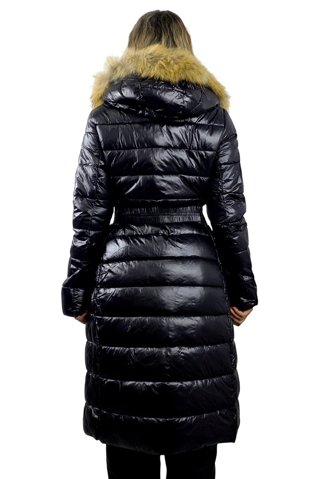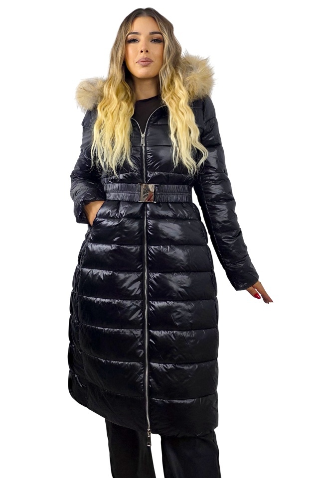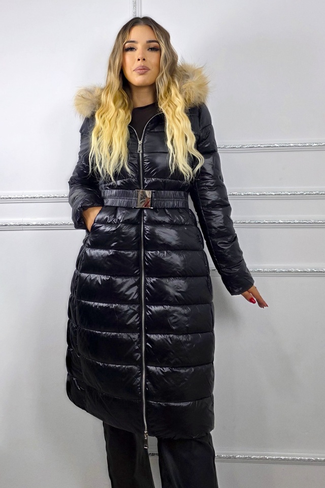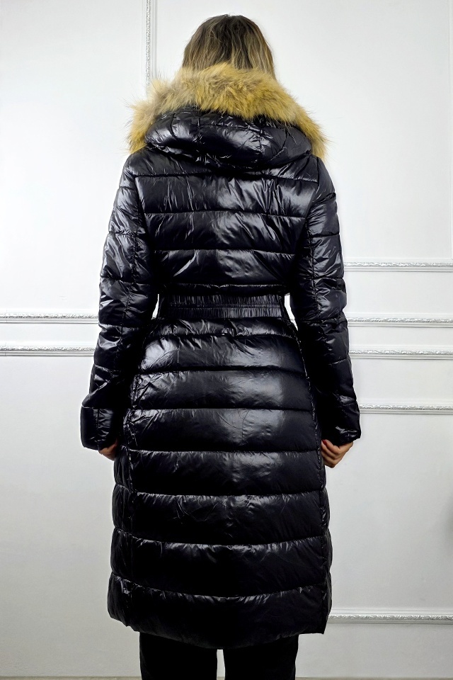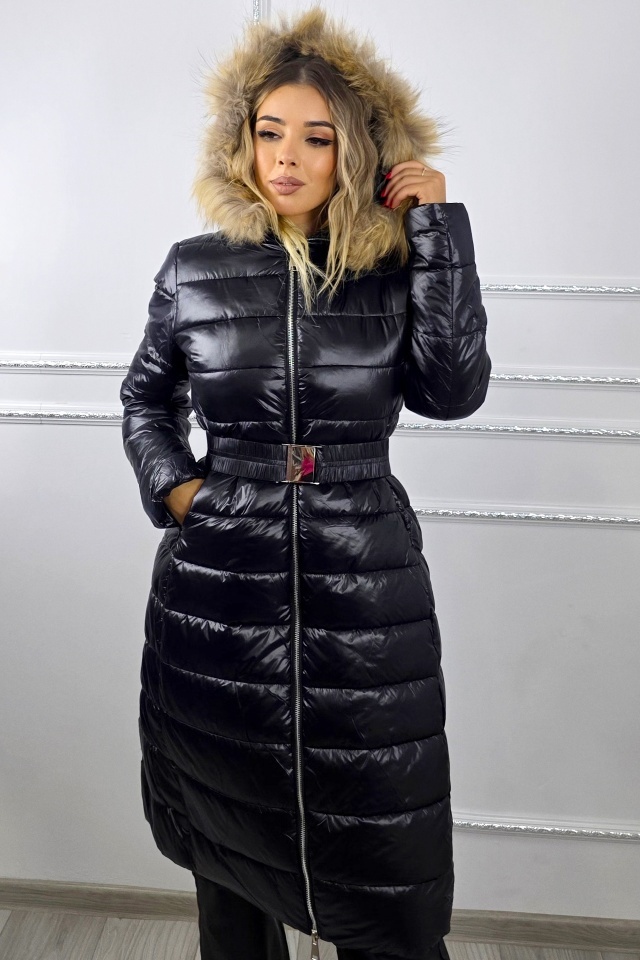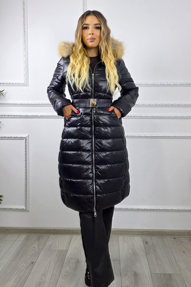 Geaca matlasata, de dama HYRA, cu gluga detasabila din blana naturala, Negru