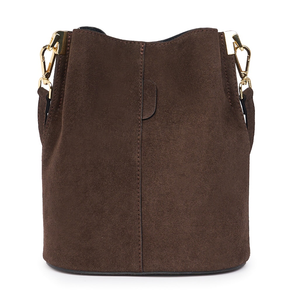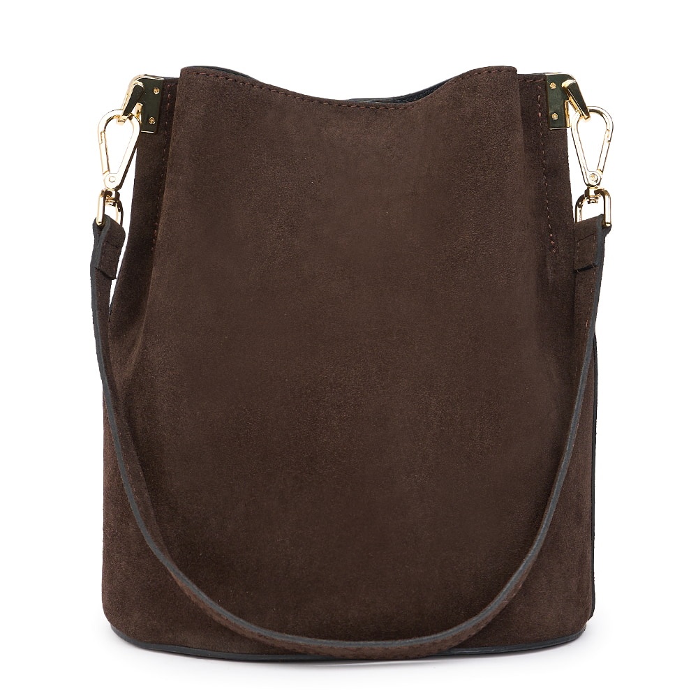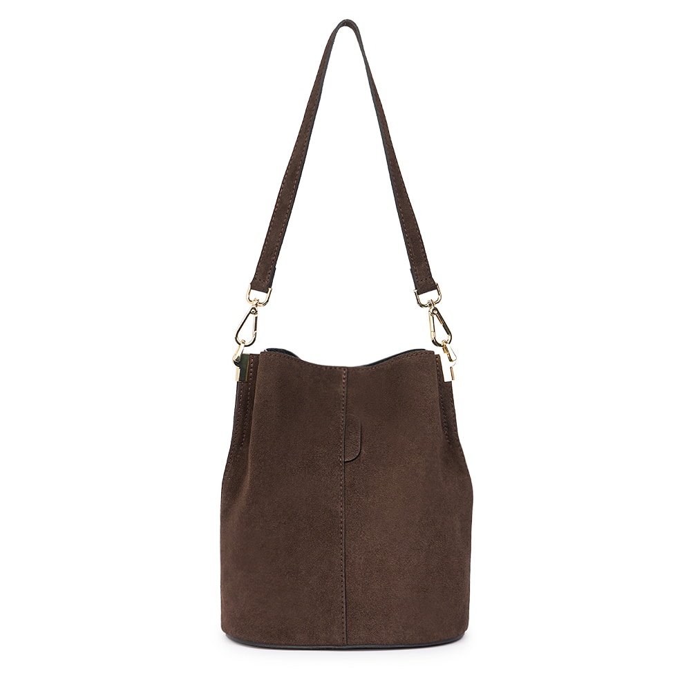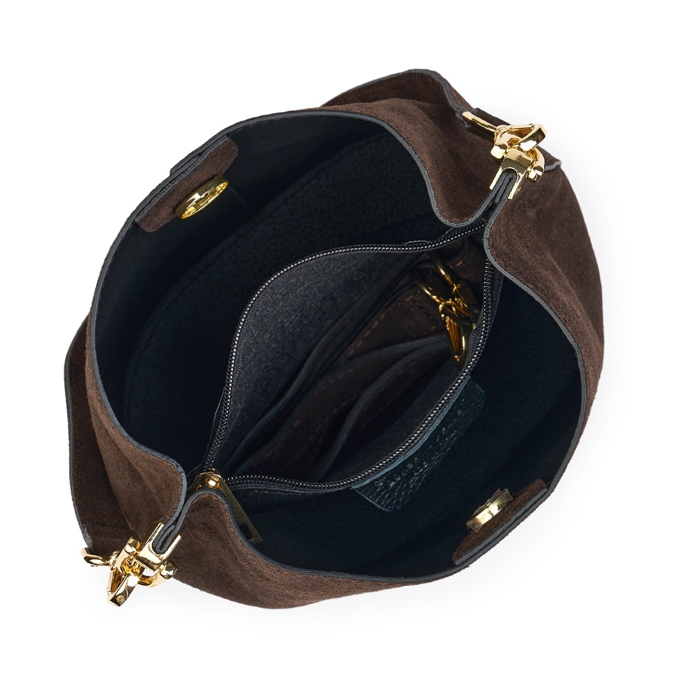 Geanta din piele naturala Milena maro inchis este un accesoriu elegant si versatil, ideal pentru un stil modern, discret. Realizata din piele intoarsa, cu un aspect deosebit de elegant, geanta impresioneaza prin textura fina si finisajele impecabile. Forma sa tip „bucket bag” ofera un spatiu generos pentru obiectele esentiale de zi cu zi, in timp ce sistemul de inchidere sigur si cureaua de umar reglabila asigura confort si functionalitate. MATERIAL: piele naturala DIMENSIUNI (inaltime x lungime x latime): 28x24x17cm COMPARTIMENTE: doua compartimente separate de un buzunar cu fermoar BUZUNARE: fara buzunare SISTEM DE PRINDERE: bretea de umar detasabila scurta (53 cm) + bretea de umar detasabila, reglabila (50-123cm) CULOARE ACCESORII: argintiu