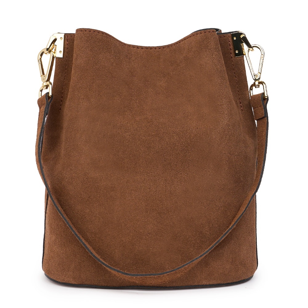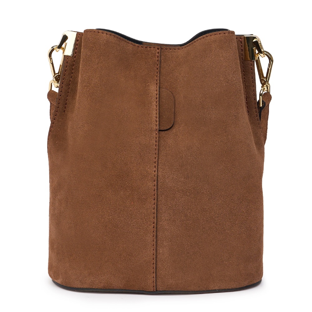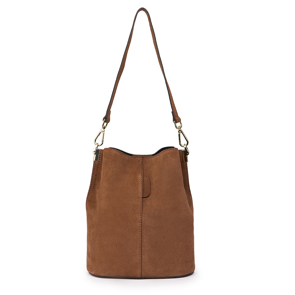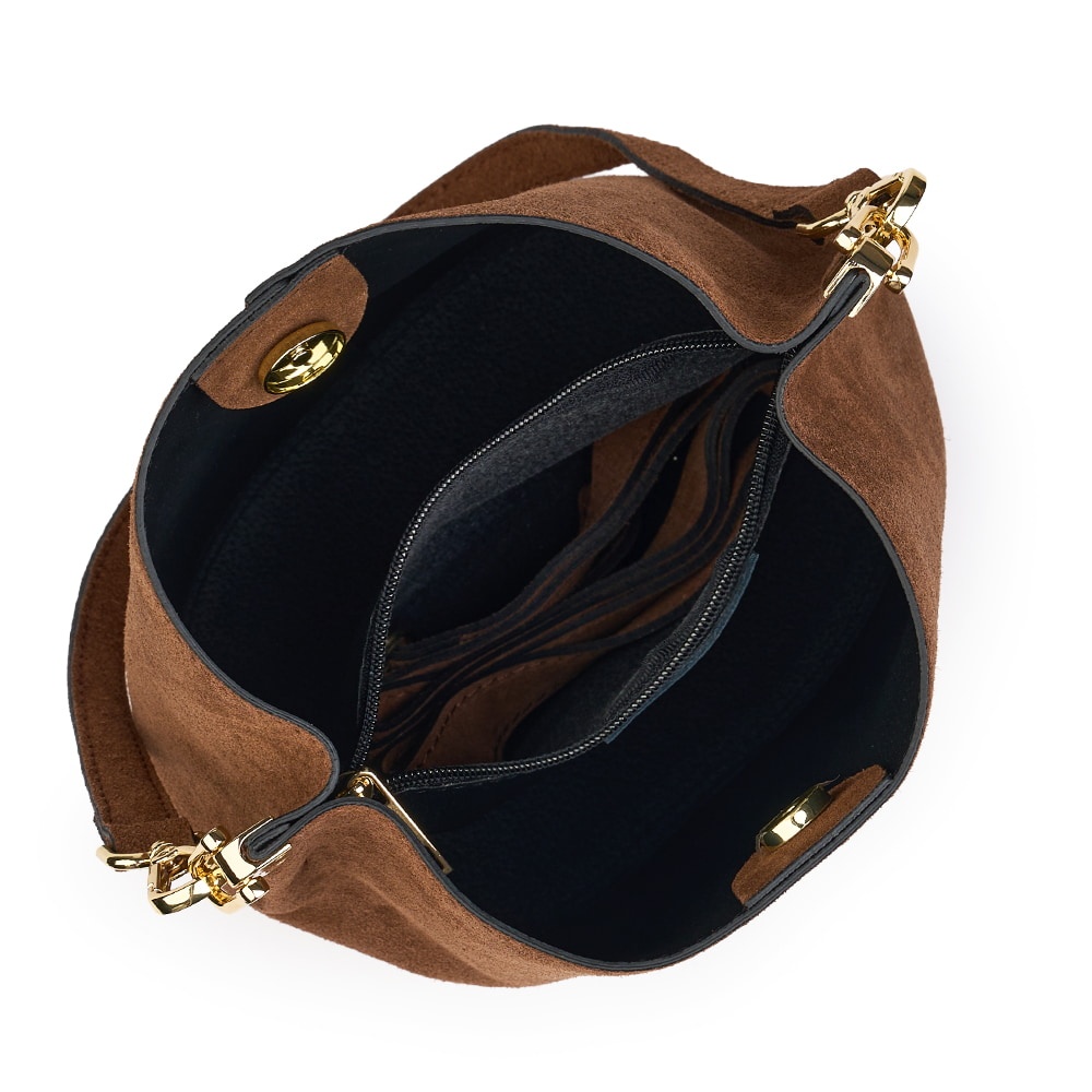 Geanta din piele naturala Milena maro este un accesoriu elegant si versatil, ideal pentru un stil modern, discret. Realizata din piele intoarsa, cu un aspect deosebit de elegant, geanta impresioneaza prin textura fina si finisajele impecabile. Forma sa tip „bucket bag” ofera un spatiu generos pentru obiectele esentiale de zi cu zi, in timp ce sistemul de inchidere sigur si cureaua de umar reglabila asigura confort si functionalitate. MATERIAL: piele naturala DIMENSIUNI (inaltime x lungime x latime): 28x24x17cm COMPARTIMENTE: doua compartimente separate de un buzunar cu fermoar BUZUNARE: fara buzunare SISTEM DE PRINDERE: bretea de umar detasabila scurta (53 cm) + bretea de umar detasabila, reglabila (50-123cm) CULOARE ACCESORII: argintiu