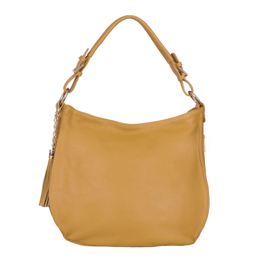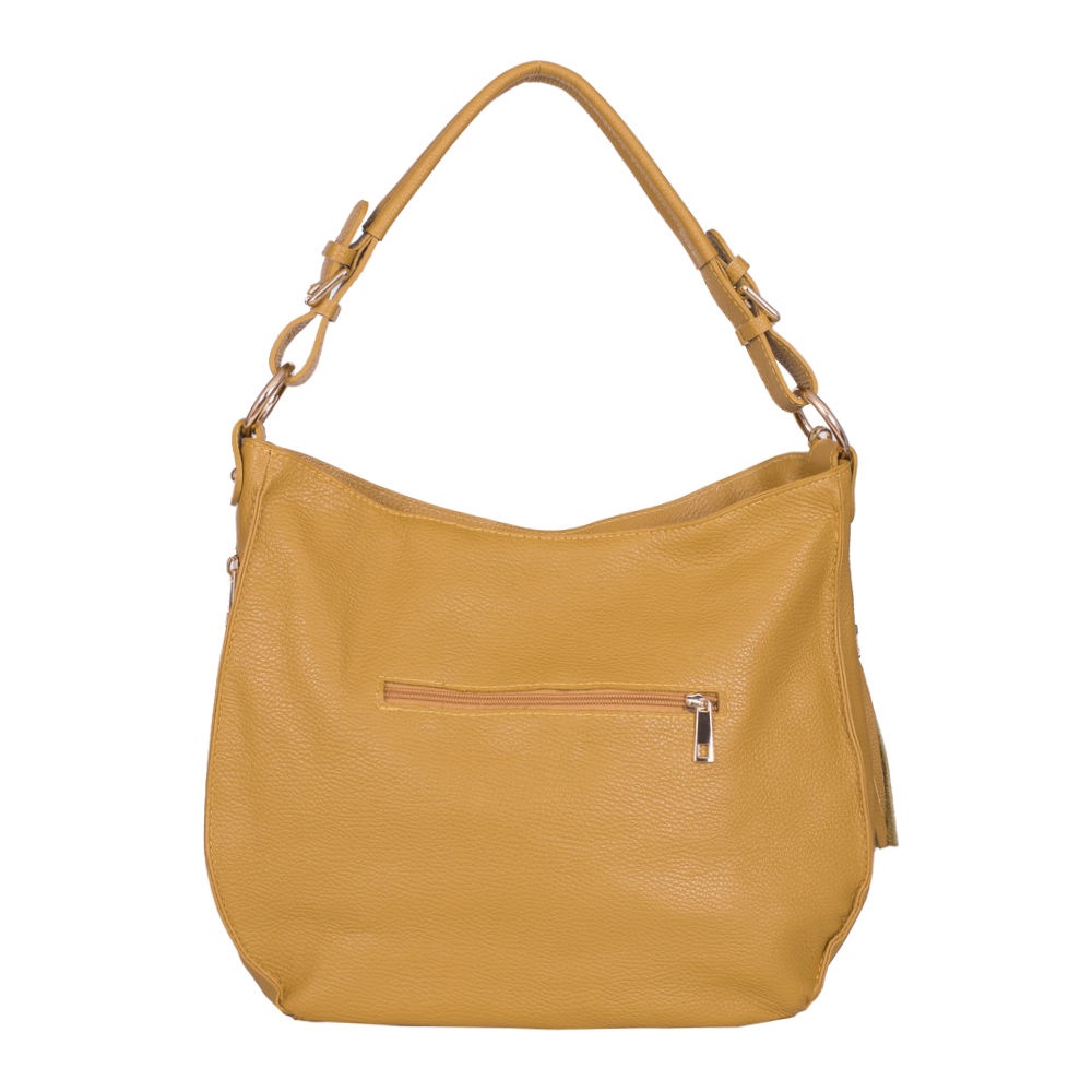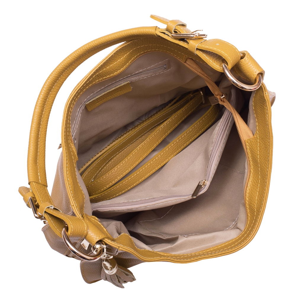 Geanta dama din piele naturala Edina galbena este un model clasic, elegant prin simplitatea sa. Se asorteaza cu tinutele casual, fiind o geanta de zi cu zi excelenta. Este accesorizata cu elemente metalice aurii, ce aduc un look rafinat. MATERIAL: piele naturala DIMENSIUNI (inaltime x lungime x latime la baza): 29x36x13cm INALTIME MANER: 26cm - permite atat purtarea pe brat cat si pe umar GREUTATE: 820g COMPARTIMENTE: doua compartimente separate de un buzunar mare, cu fermoar BUZUNARE: buzunar interior cu fermoar; buzunar interior fara fermoar; buzunar exterior cu fermoar pe partea din spate; buzunar lateral cu fermoar SISTEM DE PRINDERE: maner ce permite purtarea pe brat sau pe umar + bretea de umar detasabila, reglabila, 60-125cm CULOARE ACCESORII: auriu