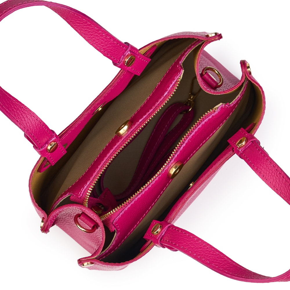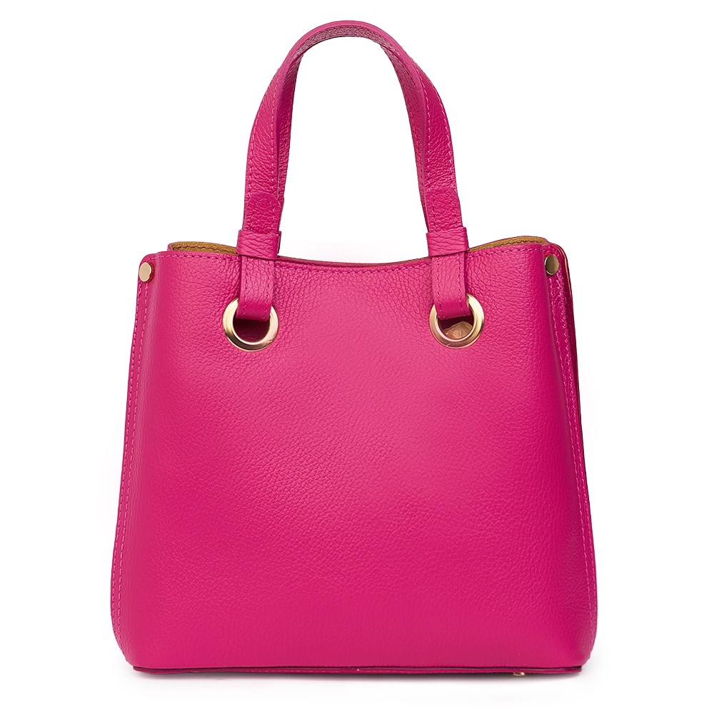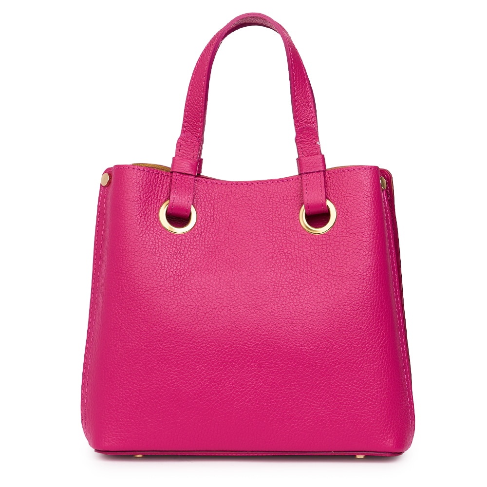Geanta dama din piele naturala Ilona fucsia este un model cu dimensiuni compacte dar bine compartimentat. La interior dispune de trei compartimente, dintre care unul inchis cu fermoar si doua inchise cu capse magnetice. Este un model cu linii clasice, foarte practic, ideal pentru utilizare de zi cu zi. MATERIAL: piele naturala DIMENSIUNI (inaltime x lungime x latime): 24x25x12cm DIMENSIUNI MANER: inaltime: 16cm; lungime: 35cm COMPARTIMENTE: trei compartimente BUZUNARE: fara buzunare SISTEM DE PRINDERE: doua manere ce permit purtarea pe brat sau in mana + bretea de umar detasabila, reglabila (50-110cm) CULOARE ACCESORII: auriu
