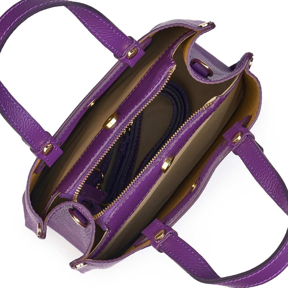 Geanta dama din piele naturala Ilona mov este un model cu dimensiuni compacte dar bine compartimentat. La interior dispune de trei compartimente, dintre care unul inchis cu fermoar si doua inchise cu capse magnetice. Este un model cu linii clasice, foarte practic, ideal pentru utilizare de zi cu zi. MATERIAL: piele naturala DIMENSIUNI (inaltime x lungime x latime): 24x25x12cm DIMENSIUNI MANER: inaltime: 16cm; lungime: 35cm COMPARTIMENTE: trei compartimente BUZUNARE: fara buzunare SISTEM DE PRINDERE: doua manere ce permit purtarea pe brat sau in mana + bretea de umar detasabila, reglabila (50-110cm) CULOARE ACCESORII: auriu