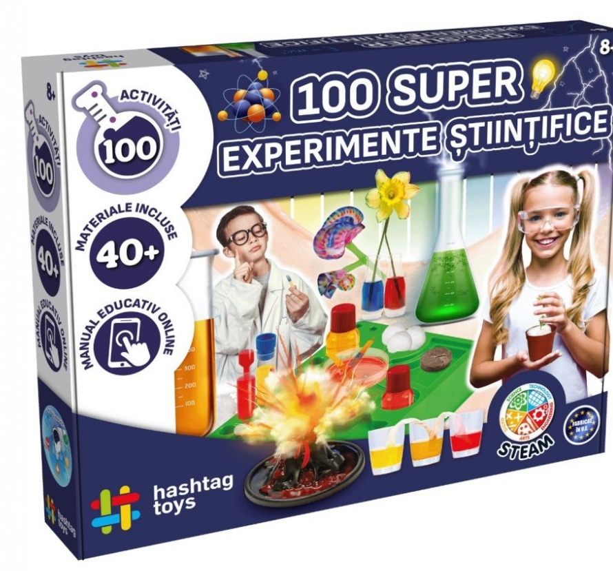Devino un adevarat om de stiinta cu incredibilul Set 100 Experimente stiintifice! Exploreaza lumea fascinanta a stiintei cu cele 100 de experimente distractive pregatite special pentru tine! Acest set stiintific include 47 de componente si distractie fara sfarsit pentru o luna intreaga! Distreaza-te creand reactii chimice colorate, vulcani, cristale si slime nebunesc. Descopera cromatografia si multe altele! Continutul setului pigment rosu, pigment galben, manusi, vas Petri, ochelari de protectie, benzi pentru pH, pahar gradat mare, minge, eprubete cu capac, palnie, bile de vata, ghiveci, pipete Pasteur, benzi elastice, spatula de plastic, pahare gradate mici, masa de lucru, turba, capac pentru paharele gradate mici, baloane, vulcan, bicarbonat de sodiu, paie, sfoara din lana, fire de modelat, filtre de hartie, betisoare de lemn, spatule din lemn, seminte de fasole verde.