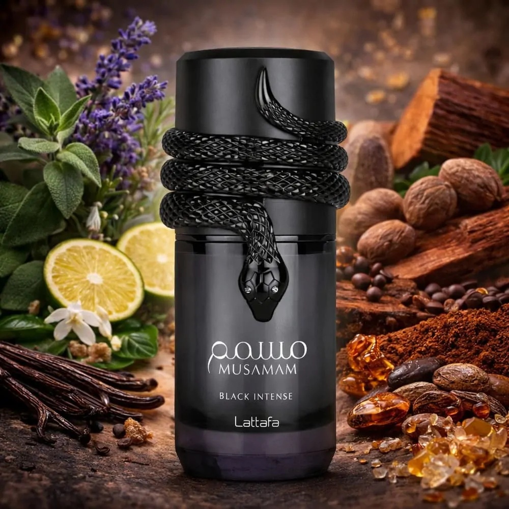 Lattafa Musamam Black Intense 100 ml – Apă de Parfum Unisex Lattafa Musamam Black Intense este un parfum modern și intens, cu un caracter elegant și persistent. Debutul aromatic-condimentat combină salvie, lavandă, nucșoară și bergamotă , oferind prospețime și echilibru. Inima floral-lemnoasă aduce note curate și aerate de rosyfolia, mahonial, mușcată și cedru , conturând o semnătură rafinată și contemporană. Baza este caldă și magnetică, cu accente gurmande de cacao , boabe de tonka și arțar , completate de paciuli și Ambrofix , pentru o longevitate și proiecție remarcabile. Un parfum unisex sofisticat, ideal pentru orice moment al zilei.