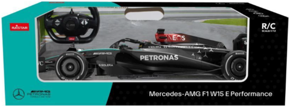 Copilul dumneavoastra se poate juca in voie cu masina cu telecomanda MERCEDES AMG F1 W15 E PERFORMANCE, scara 1 la 12 , oferita de brandul international Rastar. Nicio cursa nu este imposibil de castigat cu acesta masinuta, replica oficiala cu licenta a modelului original, construita cu mare atentie la detalii. Masinuta are proportiile ideale pentru momente pline de distractie si amuzament, avand dimensiunile in centimetri dupa cum urmeaza 47*17*10. Masinuta functioneaza pe frecventa de 2.4G.Alimentarea se face astfel pentru masinuta sunt necesare 5 baterii tip AA , iar pentru telecomanda 2 baterii AA.Masinuta se poate deplasa in toate directiile inainte, inapoi, stanga sau dreapta. Masina cu telecomanda MERCEDES AMG F1 W15 E PERFORMANCE, scara 1 la 12 , poate rula cu o viteza aproximativa de 10km/h, are tractiune 2WD, anvelope de cauciuc, posibilitate de reglaj a directiei direct pe sasiu si o raza de actiune a telecomenzii de circa 20 de metri.