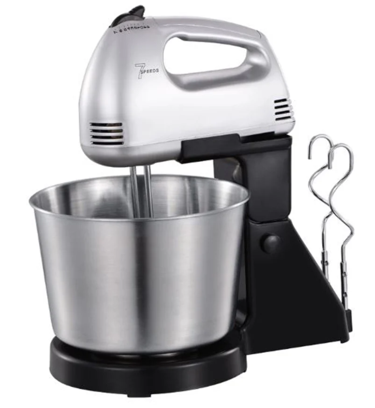 Mixerul are 7 viteze, vine impreuna cu un set de accesorii cu palete lamelare si carlige pentru framantare pentru a putea sa faci creme, sa bati frisca, maioneza sau aluatul preferat asa cum iti doresti. Incearca azi mixerul si surprinde-i pe toti cu veleitatile tale culinare! - Cu acest mixer vei castiga nu numai timp, dar veti putea sa va imbogatiti meniul cu tot felul de retete noi. Si asta pentru ca puterea de 350 W, reglabila in 7 trepte de viteza, se imbina perfect cu multitudinea de functii pe care mixerul le indeplineste cu usurinta. - Descopera placerea prepararii prajiturilor fara efort, datorita bolului sau autorotativ cu capacitate de 2 L. Accesoriile esentiale sunt intotdeauna la indemana cu cele doua teluri din otel inoxidabil si cele doua carlige pentru a bate albusuri de oua, frisca sau pentru a framanta aluat. Specificatii - Putere 350 W - 7 Trepte de viteza - Capacitate Bol 2 L - Palete din Otel Inoxidabil - Functie Turbo - Carcasa ABS + Inox - Maner Ergonomic - Alimentare 220 - 240 V - Design Clasic Caracteristici: Material carcasă: PP Motor: Motor din cupru Material cablu de alimentare: cupru 7 viteze, putere 350W, BOL DIN INOX DE 2L 2 buc palete cu înveliș metalic 2 buc cârlige cu înveliș metalic