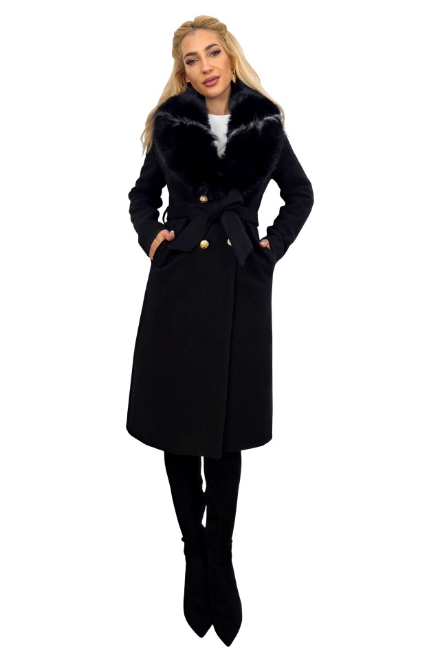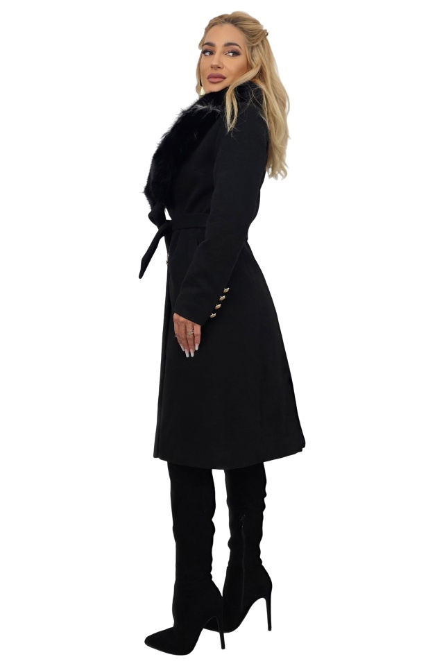 Palton elegant de dama MABELL, cu blana si inchidere cu butoni aurii, Negru