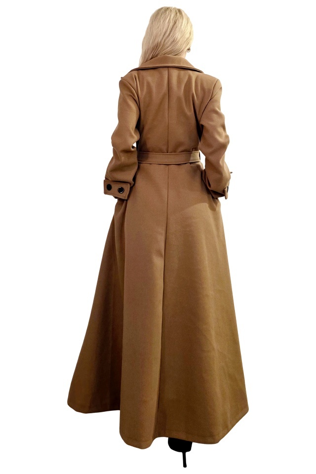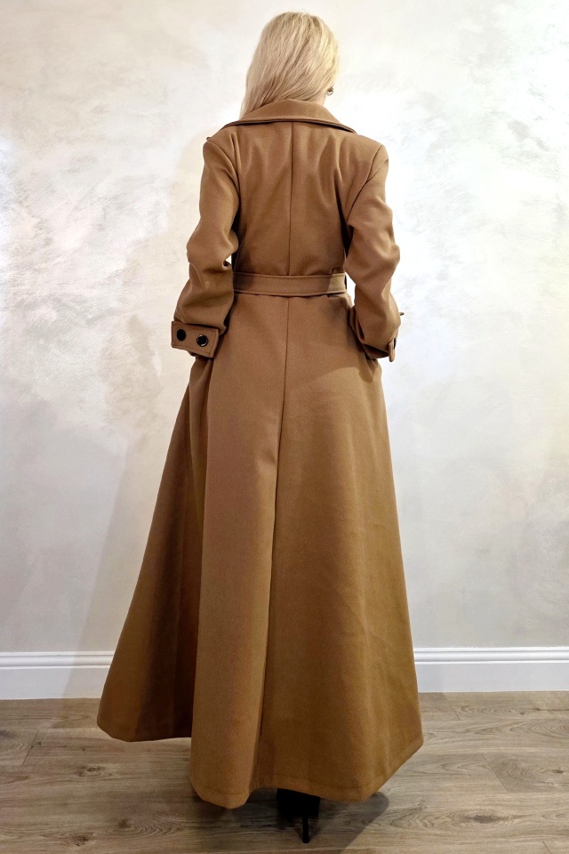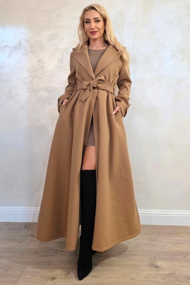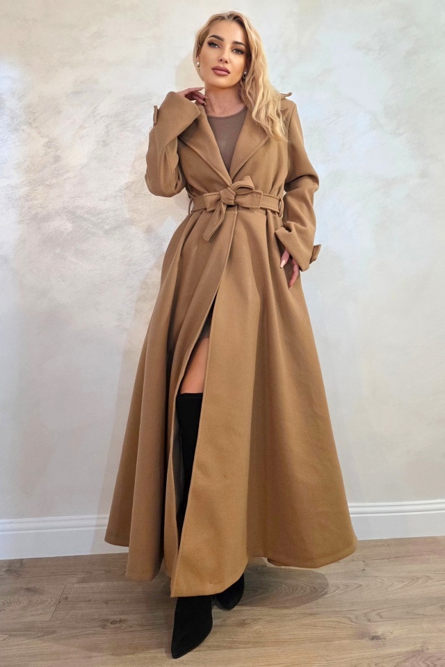 Palton lung cu nasturi Merina, falduri si cordon, Bej, Marime S/M/L