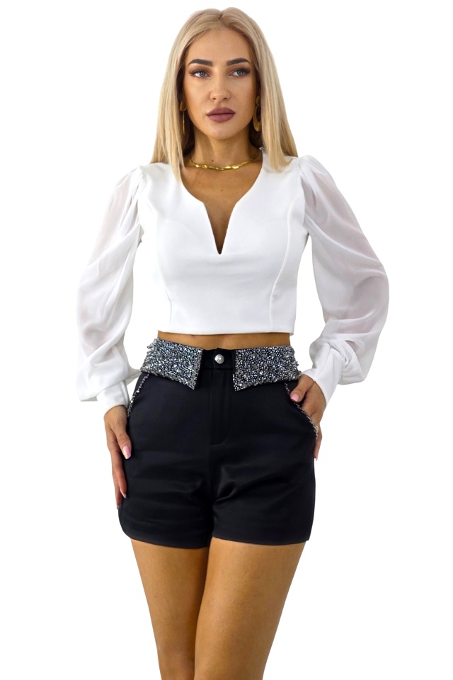Pantaloni scurti eleganti MAVY, accesorizati cu cristale si detalii artizanale, Negru Caracteristici pantaloni scurti: - croiala cu talie inalta si panou suprapus cu aplicatii artizanale si cristale ce ofera stralucire - material cu textura densa si placuta la atingere - inchidere clasica cu nasture si fermoar - buzunare laterale cu taiere oblica incrustata cu margelute de efect - material: 100% polyester; Eticheta produsului conține informații esențiale referitoare la întreținerea și spălarea corectă a articolelor vestimentare. Imaginile Fashionforyou au caracter informativ, iar nuanta, tonul si intensitatea culorii pot varia in functie de monitor/ecran telefon.