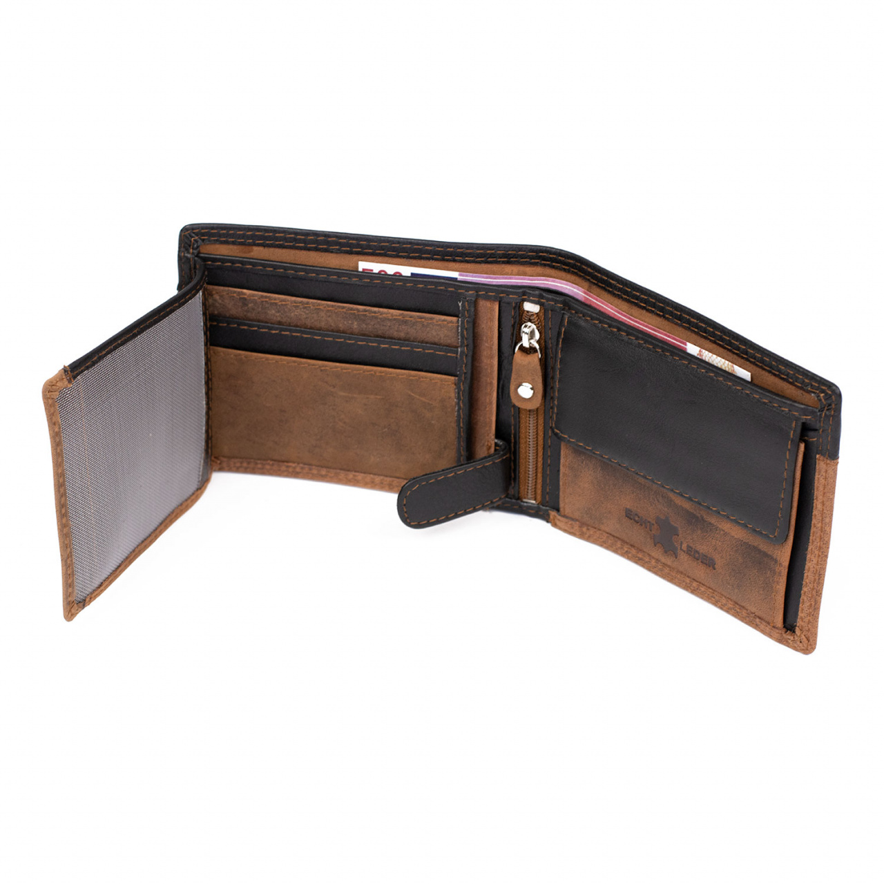 Acest portofel bărbătesc din piele naturală se mândrește cu un design clasic, sofisticat, perfect pentru bărbatul modern. Cusăturile fine și atent executate înconjura contururile portofelului, îmbinându-se armonios cu nuanța profundă și rafinată a pielii de calitate superioară. Ușor de deschis și închis datorită clapetei sale bine concepute, acest portofel are un compartiment amplu pentru bancnote și mai multe sloturi pentru carduri și documente. Cu o atingere plăcută și moale, portofelul se așează cu naturalețe în mână, evidențiind calitatea și durabilitatea materialului. Logoul discret, încrustat pe partea din față, adaugă un plus de eleganță, oferind o notă distinctivă. Cu un echilibru perfect între funcționalitate și stil, acest portofel din piele naturală este un accesoriu de nelipsit pentru orice gentleman. 2 x compartimente bancnote; 9 x compartimente card; un buzunar interior cu capsa, pentru monede; 1 compartiment buletin si/sau alte acte; compartiment cu fermoar în mijloc; dimensiuni: 13 x 2 x 10 cm Important: Culoarea produsului poate varia ușor datorită luminozității monitorului. Din cauza varietății instrumentelor de măsură, pot exista ușoare erori de cm, informațiile de mai sus sunt aproximative.