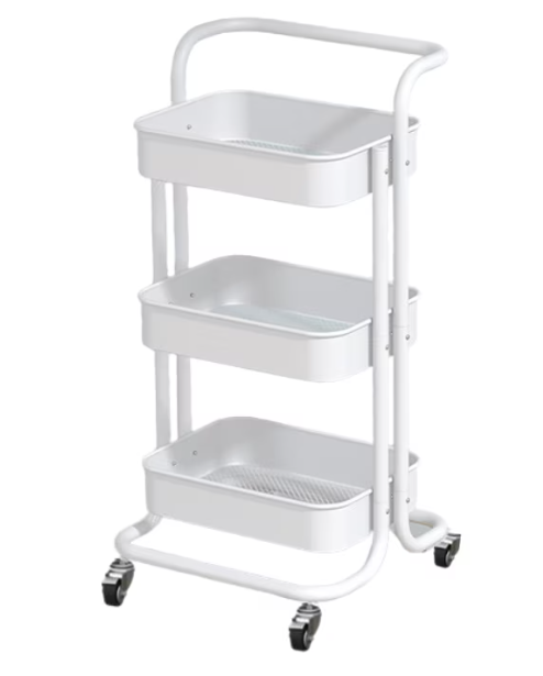 Raftul portabil cu 3 nivele de depozitare, culoare alb, dimensiuni 45x37x82 cm, este soluția practică pentru organizarea eficientă a spațiului în bucătărie, baie, birou sau atelier. Construit din metal rezistent, suportă greutăți generoase pe fiecare nivel, fiind ideal pentru depozitarea alimentelor, ustensilelor, produselor de curățenie sau rechizitelor. Este prevăzut cu mânere laterale pentru transport facil și cu roți pivotante pentru deplasare ușoară între camere. Designul compact și modern economisește spațiu, menținând ordinea în locuință. Asamblarea este rapidă, iar întreținerea ușoară cu o lavetă umedă. Specificații tehnice: Tip produs: Raft portabil cu 3 nivele Material: Metal vopsit Culoare: Alb Dimensiuni: 45 x 37 x 82 cm Număr nivele: 3 rafturi spațioase Roți pivotante pentru deplasare ușoară