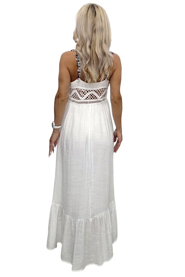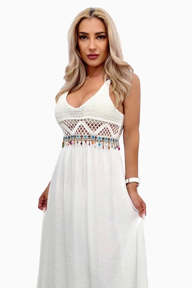 Rochie lunga de plaja TWINA, cu aspect crosetat si margele, Alb