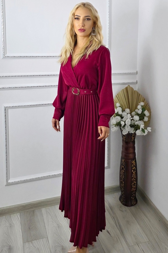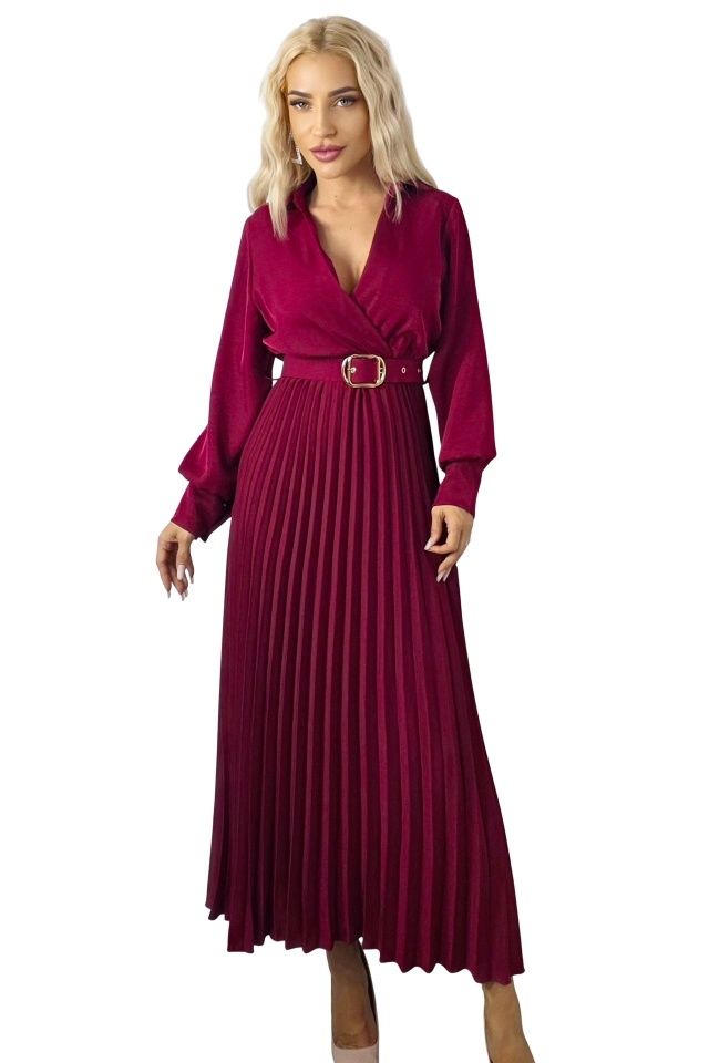 Rochie lunga plisata NOVARA, curea asortata si revere, Rosu Inchis, Marime S/M