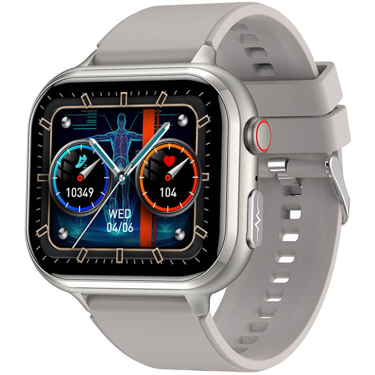Glucometru: Da<br>BPM - Bataile inimii: Da<br>MMHG - Tensiune arteriala: Da<br>SPO2 - Oxigen din sange: Da<br>EKG/ECG - Electrocardiograma: Da<br>Respingere apel: Da<br>Pedometru: Da<br>Culoare curea/bratara: Gri<br>Culoare carcasa: Argintiu<br>Control camera: Da<br>Control media: Da<br>Vreme: Da<br>Dimensiune display (inch): 1.91<br>Baterie (mAh): 380<br>Bluetooth: 5.1<br>Monitorizare somn: Da