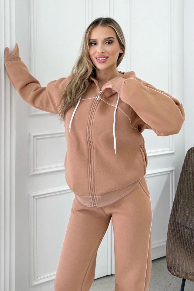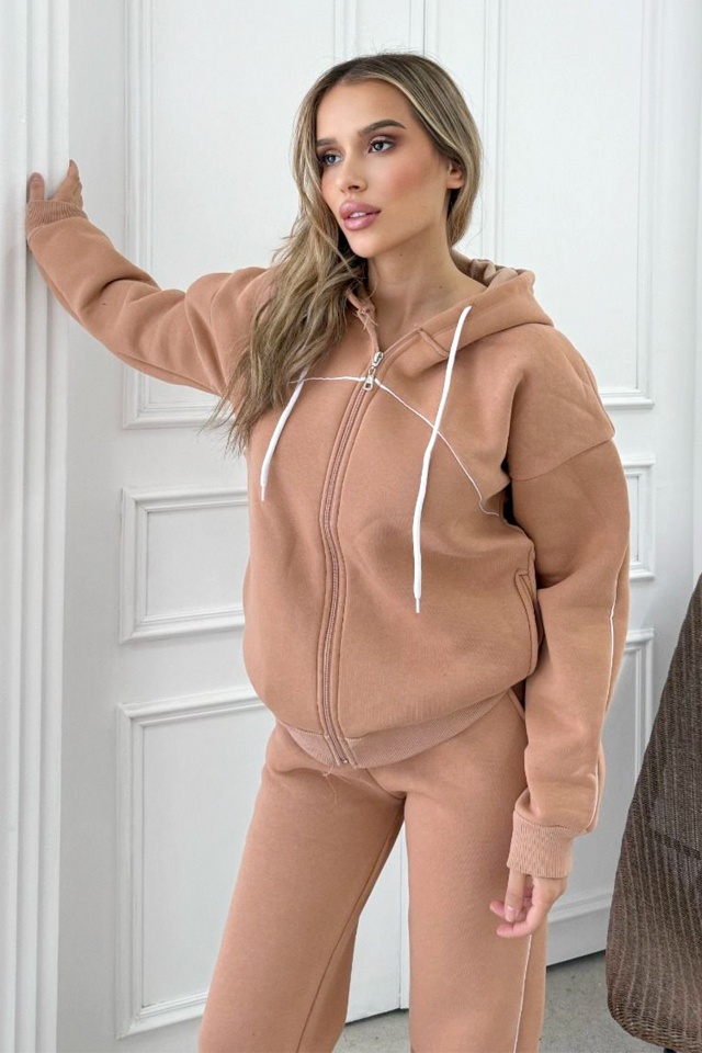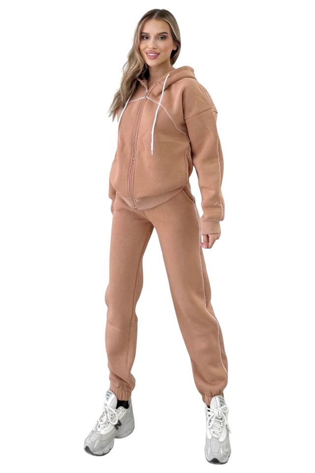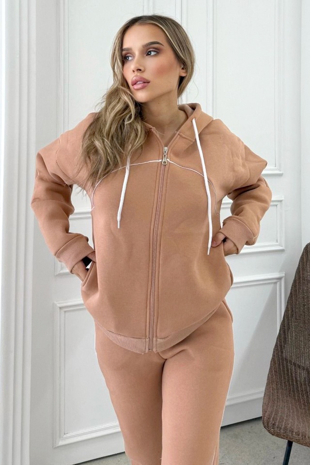 Trening vatuit cu fermoar, Zarah, bluza cu gluga si pantaloni, Bej