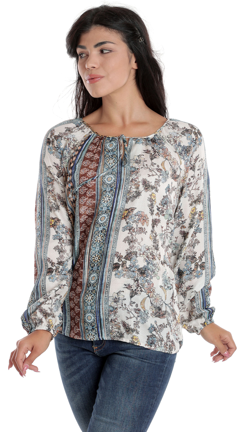 Bluza Dama, cu Maneca lunga tip IE, Alba cu Imprimeu Albastru-Maro Combinat