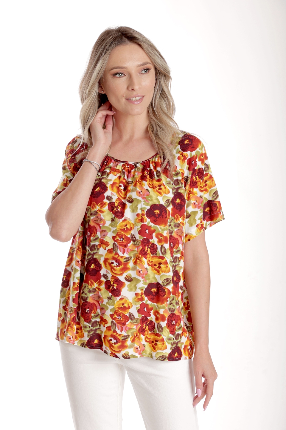Bluza Dama, Asimetrica, Bej cu imprimeu Floral si Funda